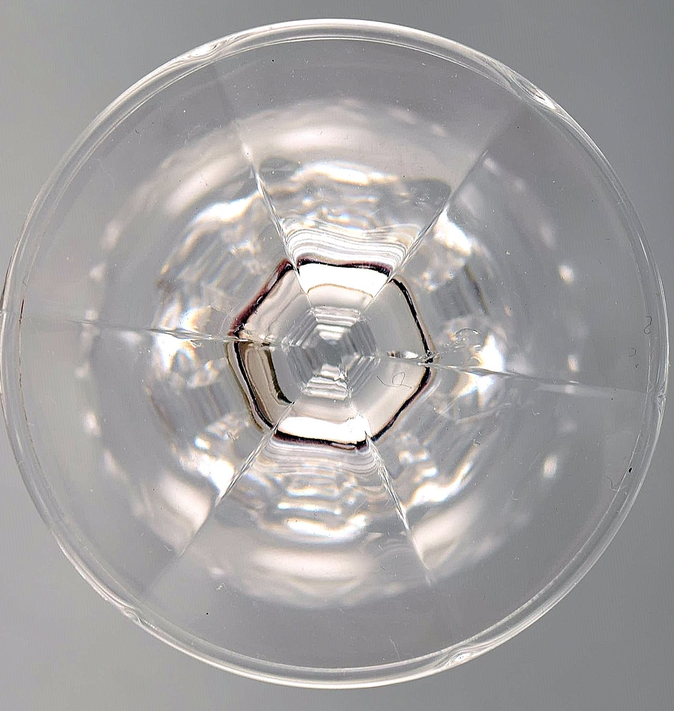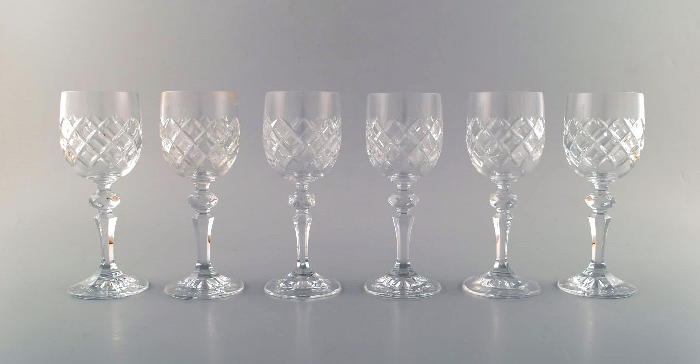 Et sæt på 6 rødvinsglas i krystal. Elegant og klassisk design i høj kvalitet. Facetslebet stilk. I flot stand. Måler: 17 x 6,5 cm.