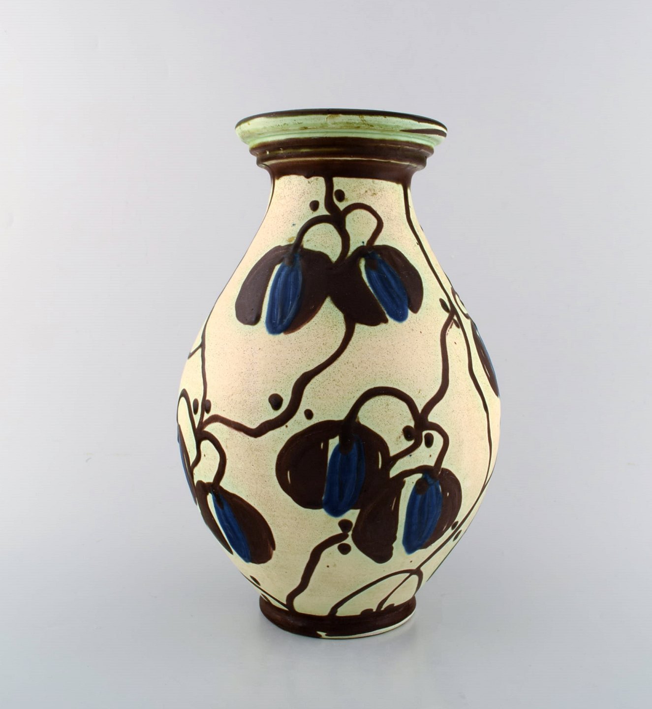 Kähler, HAK, glaseret stentøjsvase i moderne design. 1930/40´erne. Kohornsteknik. Blå og brune blomster på lys baggrund. Stemplet. Måler : 31 x 21 cm. I flot stand.