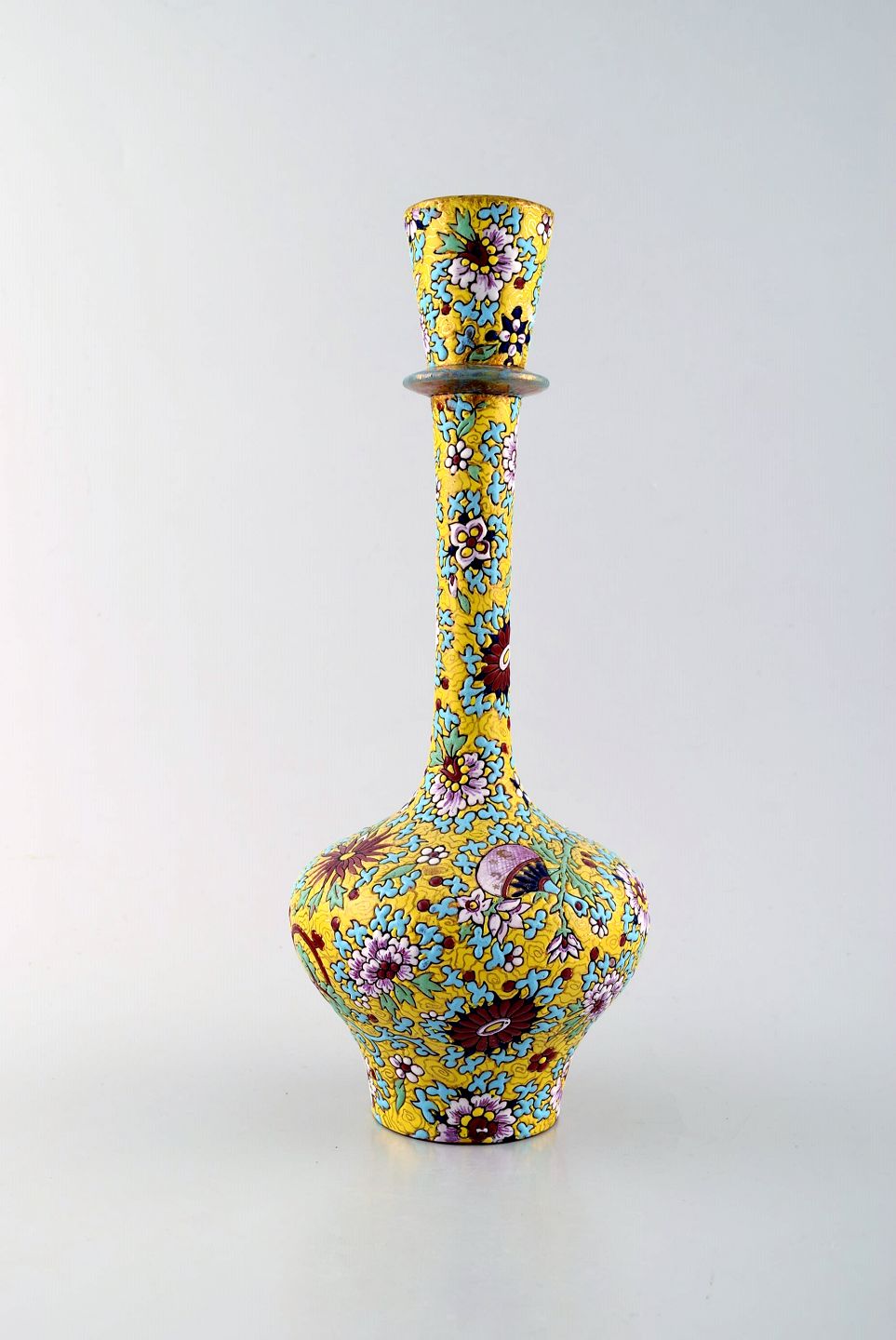 Delphin Massier for Vallauris. smalhalset unika art nouveau vase i glaseret keramik. Lyserøde blomster med blå blade på gul baggrund. Ca. 1900.