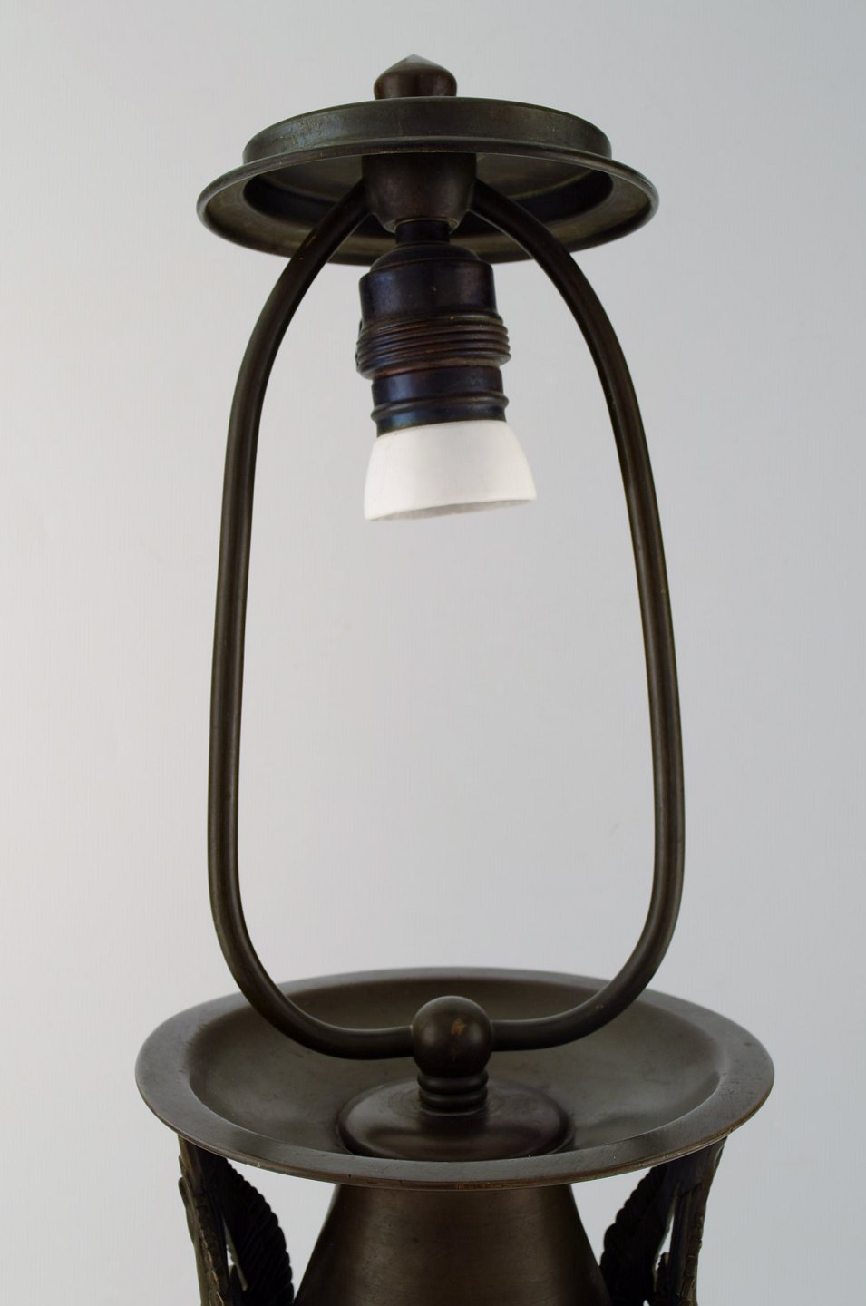 Gudmund Hentze (f. 1875, d. 1948), dansk billedhugger og maler. Bordlampe af patineret bronze med skønvirkemotiver i form af kvindeskikkelser. Ca. 1910. Udført af Tvermoes & Arahamson.