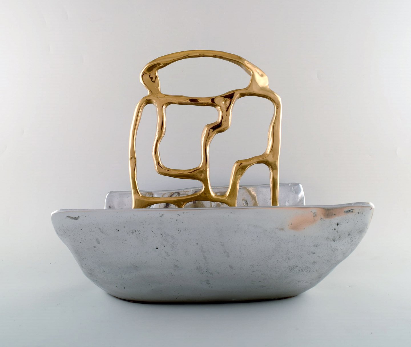 David Marshall, skotsk skulptør og designer. Stor og imponerende avisholder i aluminium med messingdekoration. Sent 1900-tallet.