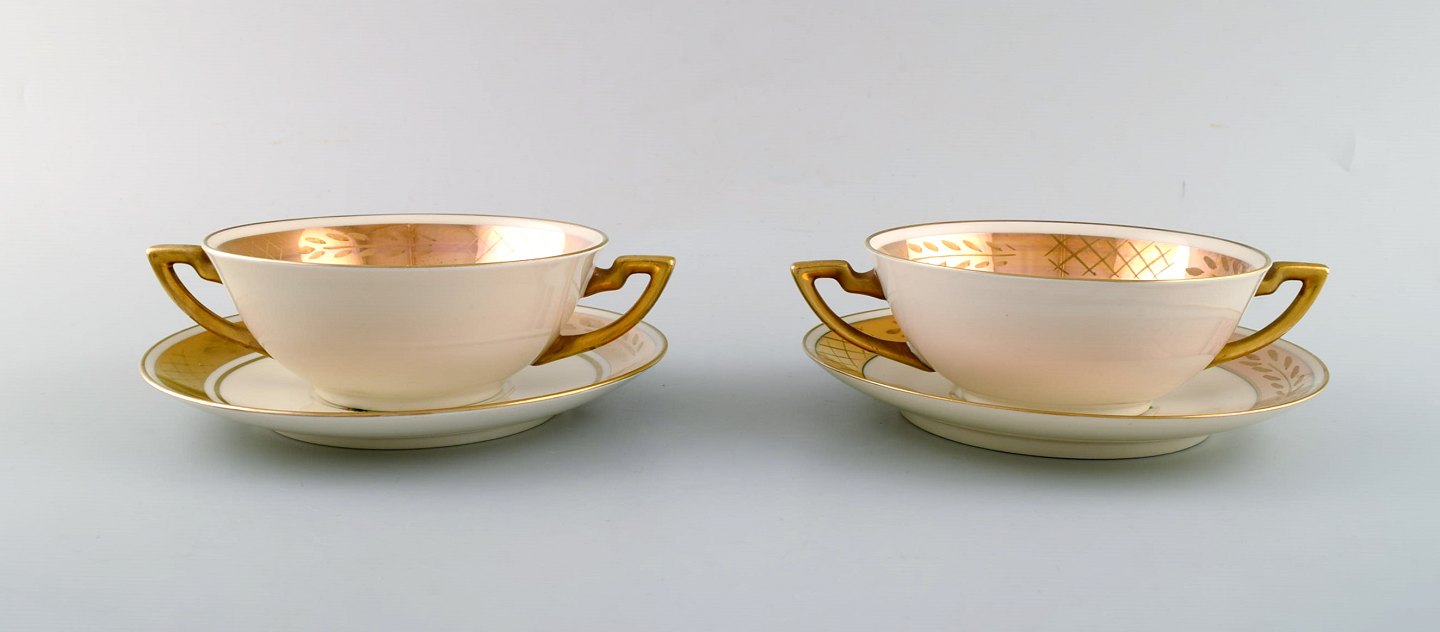 Royal Copenhagen kaffeservice. Komplet til fem personer med tilhørende tallerkener, samt to bouillonkopper. klassicistiske scener og dekoration i bladguld. Midt 1900-tallet.