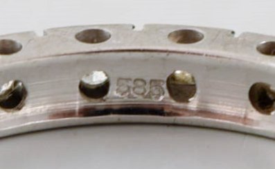 Modernistisk ring i 14 karat hvidguld med talrige diamanter.