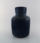 Eva Stæhr-Nielsen for Saxbo. Stor vase af stentøj i moderne design. Horisontale riller og smuk glasur i dybe blå nuancer. 1940/50'erne. Stemplet: Yin Yang. Måler: 30 x 23,5 cm. I flot stand.