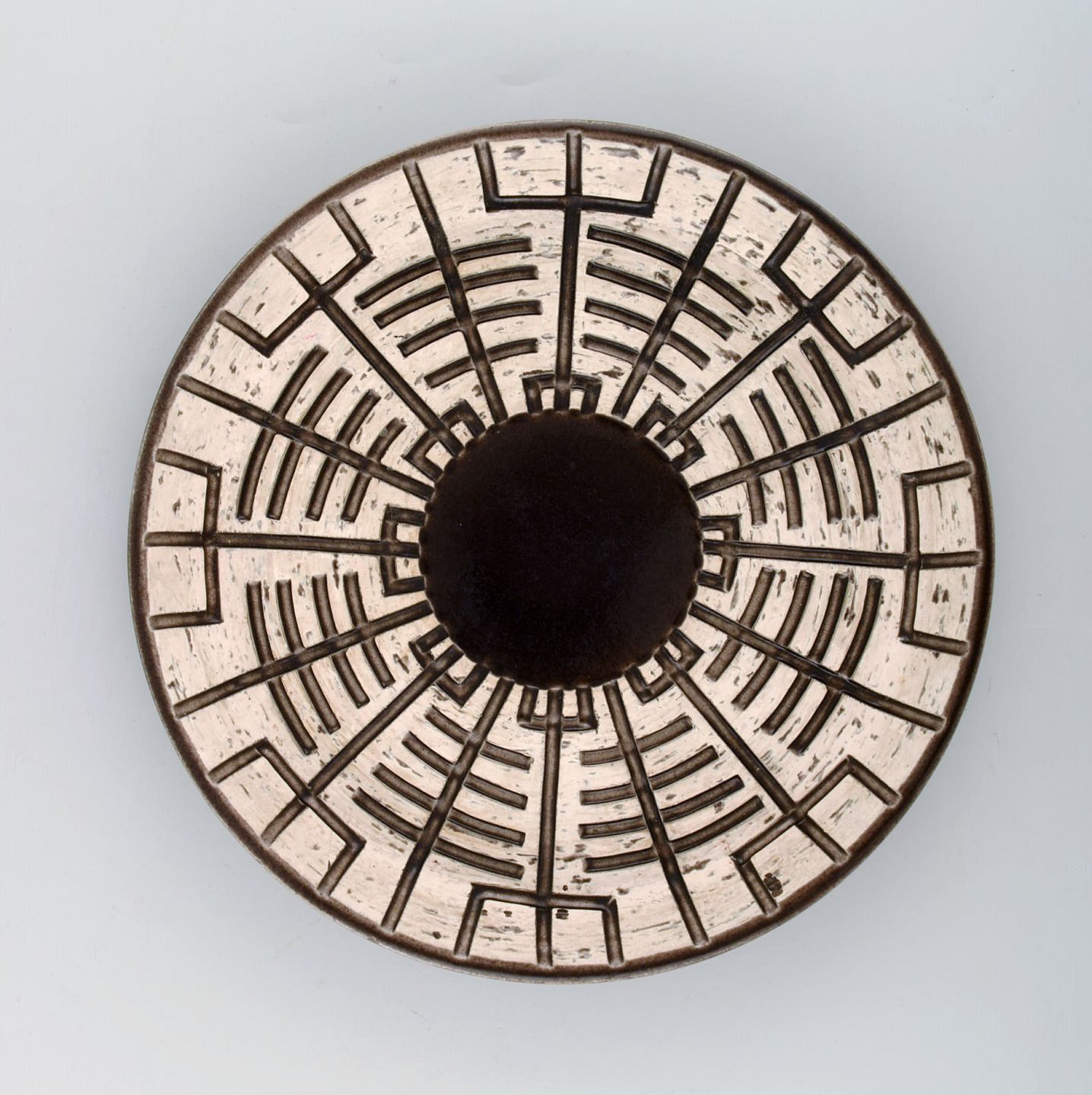 Mari Simmulson for Upsala-Ekeby. Fad i glaseret stentøj med geometrisk mønster. 1960'erne. I flot stand. Måler: 30 x 4 cm Stemplet.