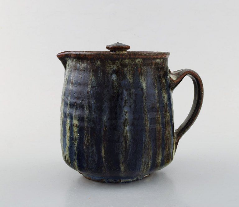 Gutte Eriksen, own workshop. Lidded jug in glazed ceramics. Raku burned technique. 1950's.