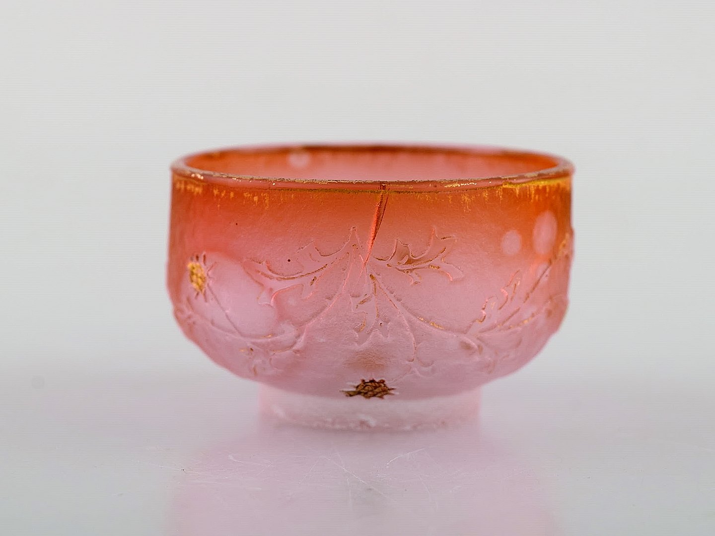 Daum Nancy, Frankrig. Lyserød art nouveau miniature skål i håndmalet mundblæst kunstglas. Blomster og gulddekoration. Ca. 1900.