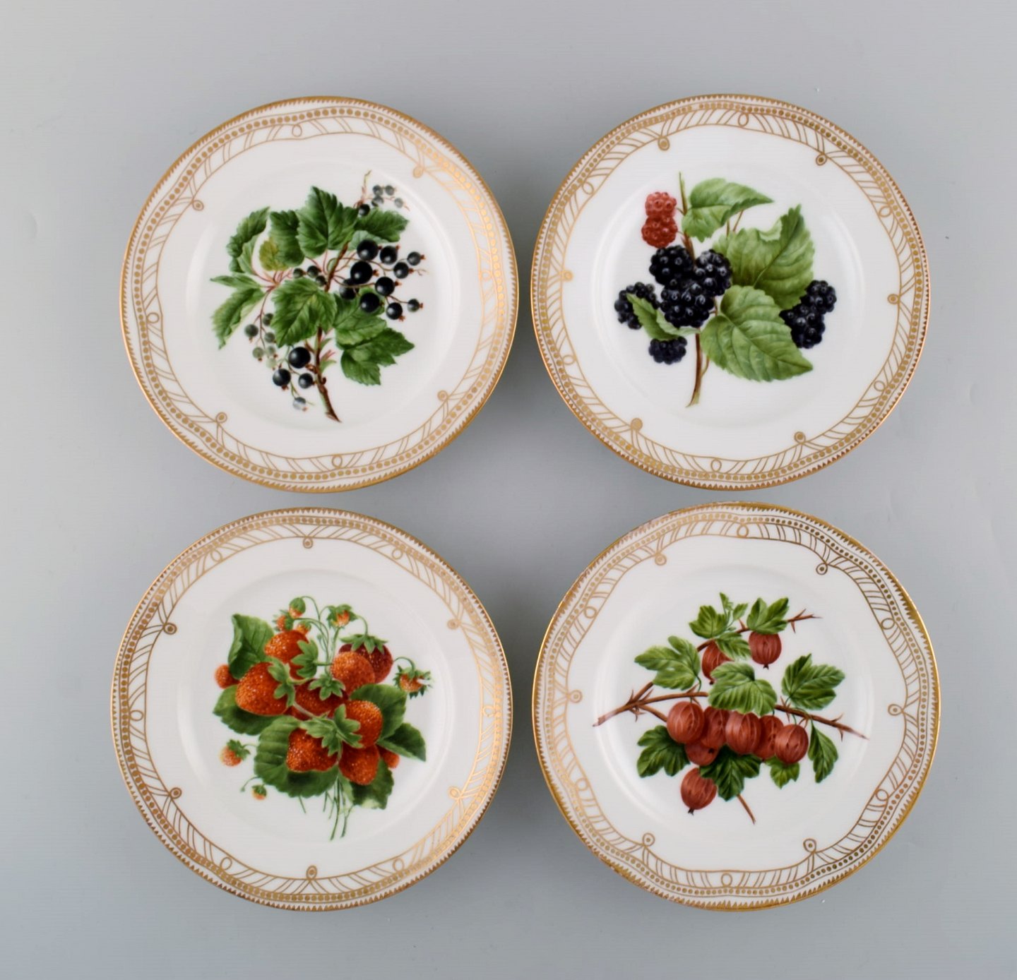 Royal Copenhagen. Ti meget sjældne håndmalede Flora Danica frugt tallerkener. Jordbær, brombær, ribs, blommer, solbær med flere. 20, 5 cm. Museumskvalitet. Ca. 1910. I flot stand. Stemplet. 1. Sortering.
