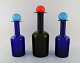 Otto Brauer for Holmegaard. En samling på fire store vaser/flasker i mørkeblåt og grønt kunstglas med låg i form af kugler. 1960'erne. Største måler: 42 x 15 cm. I perfekt stand.