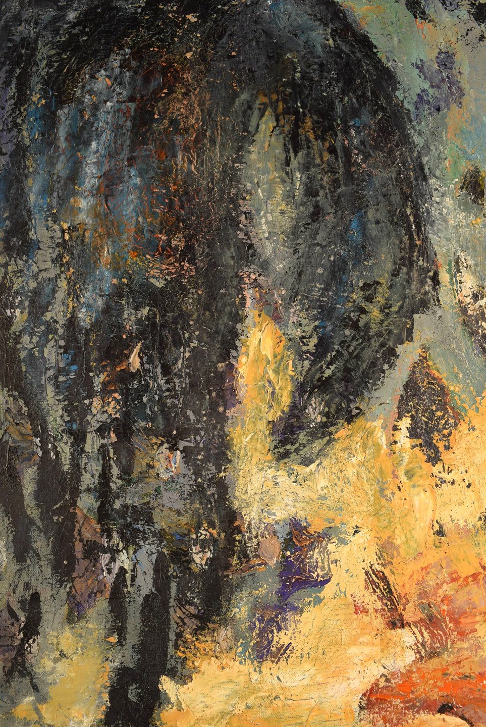 Sonja Henningsen, dansk kunstner. Olie på lærred. Abstrakt modernistisk komposition. "Tvang". 1970'erne.
