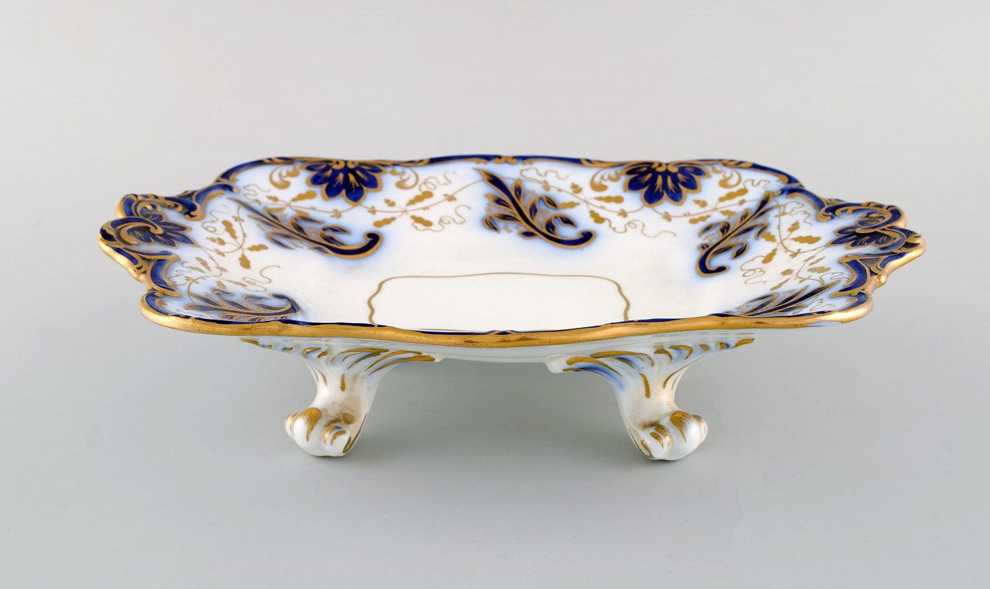 Davenport, Longport Staffordshire. Antikt teservice til otte personer i håndmalet porcelæn med lav opsats. Lilla blomster og gulddekoration. Tidligt 1900-tallet.