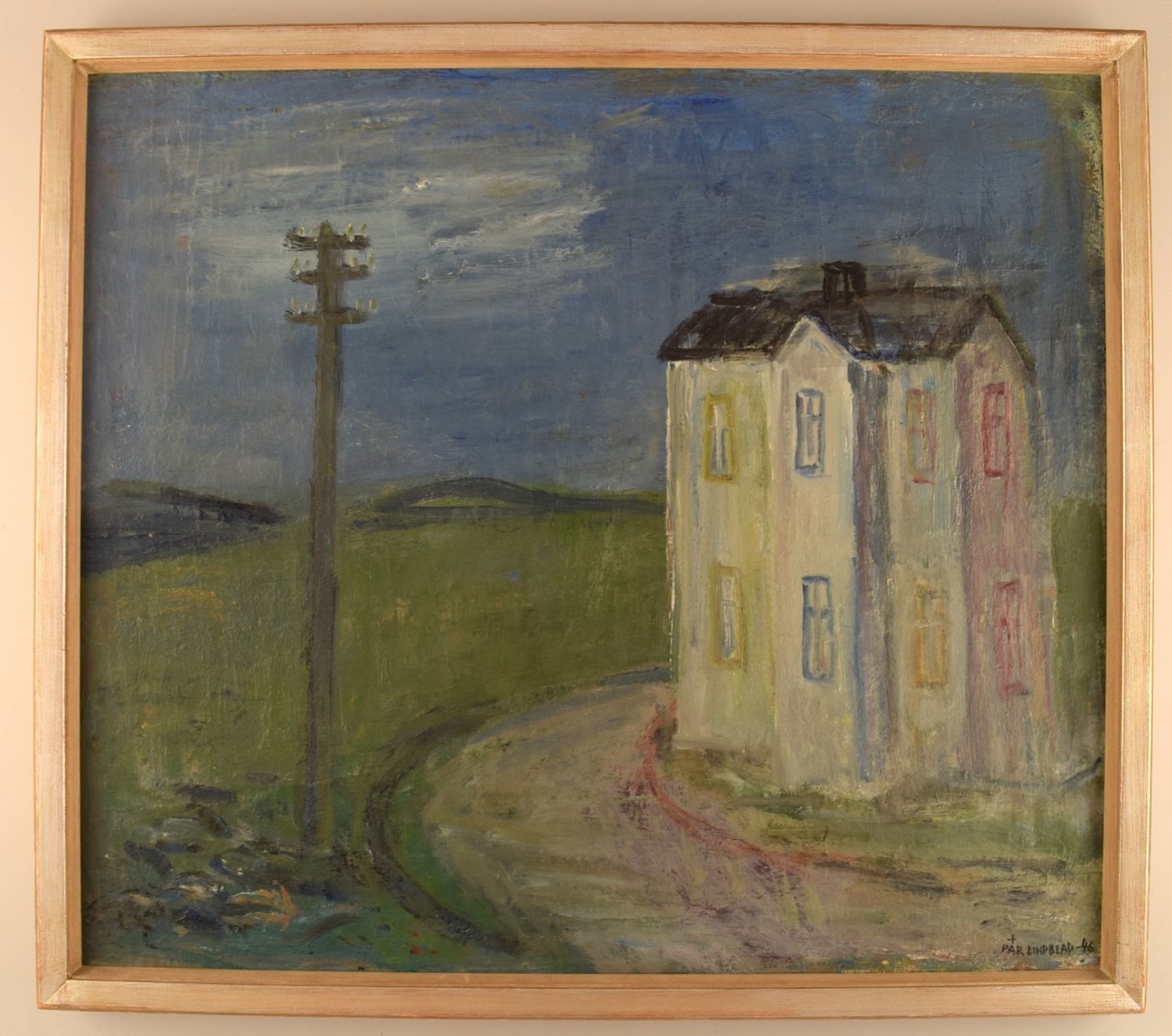 Pär Lindblad (b. 1907, d. 1981), Swedish artist. Oil on canvas. Modernist landscape with house. Dated 1946.