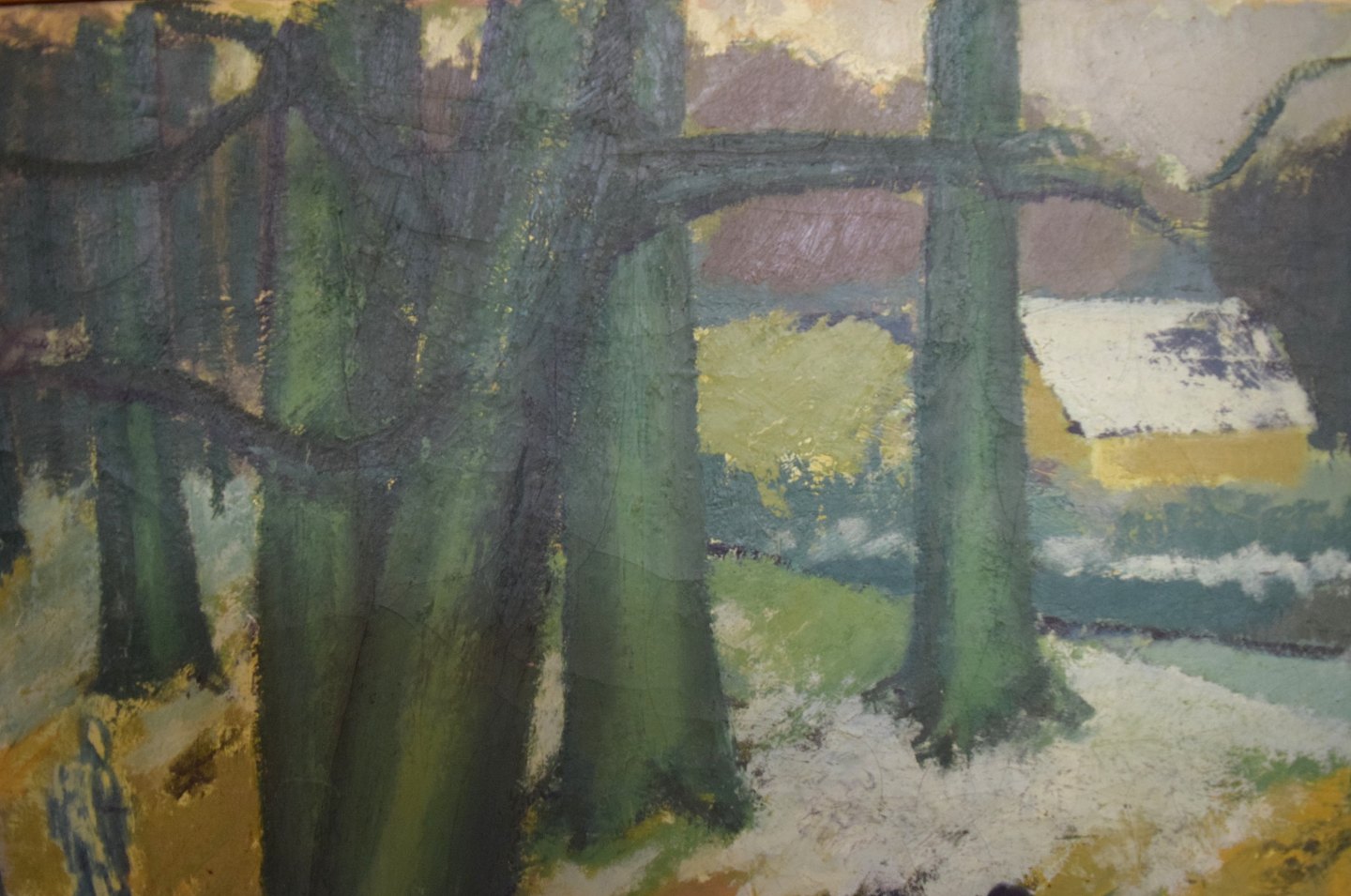 Alexander Klingspor (1897-1978), dansk kunstner. Olie på lærred. Modernistisk skovmotiv med vandrende par. Dateret 1936.