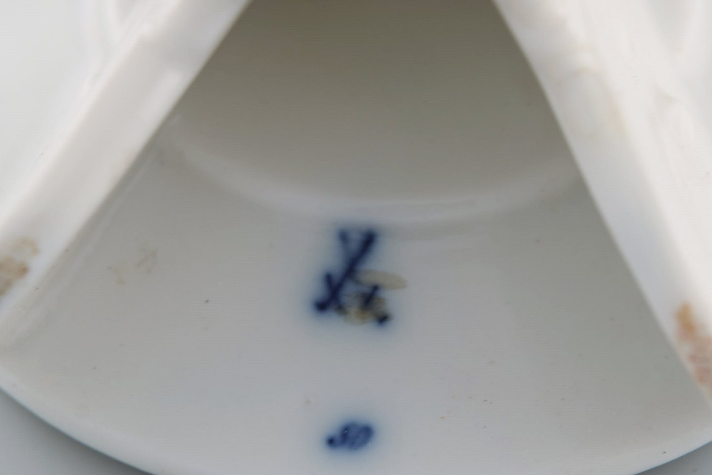 Two Meissen advertising plate holders in hand-painted porcelain. Early 20th century. Measures: 6.8 x 4.5 cm. In good condition with small chip on the backside. 2nd factory quality. Stamped.