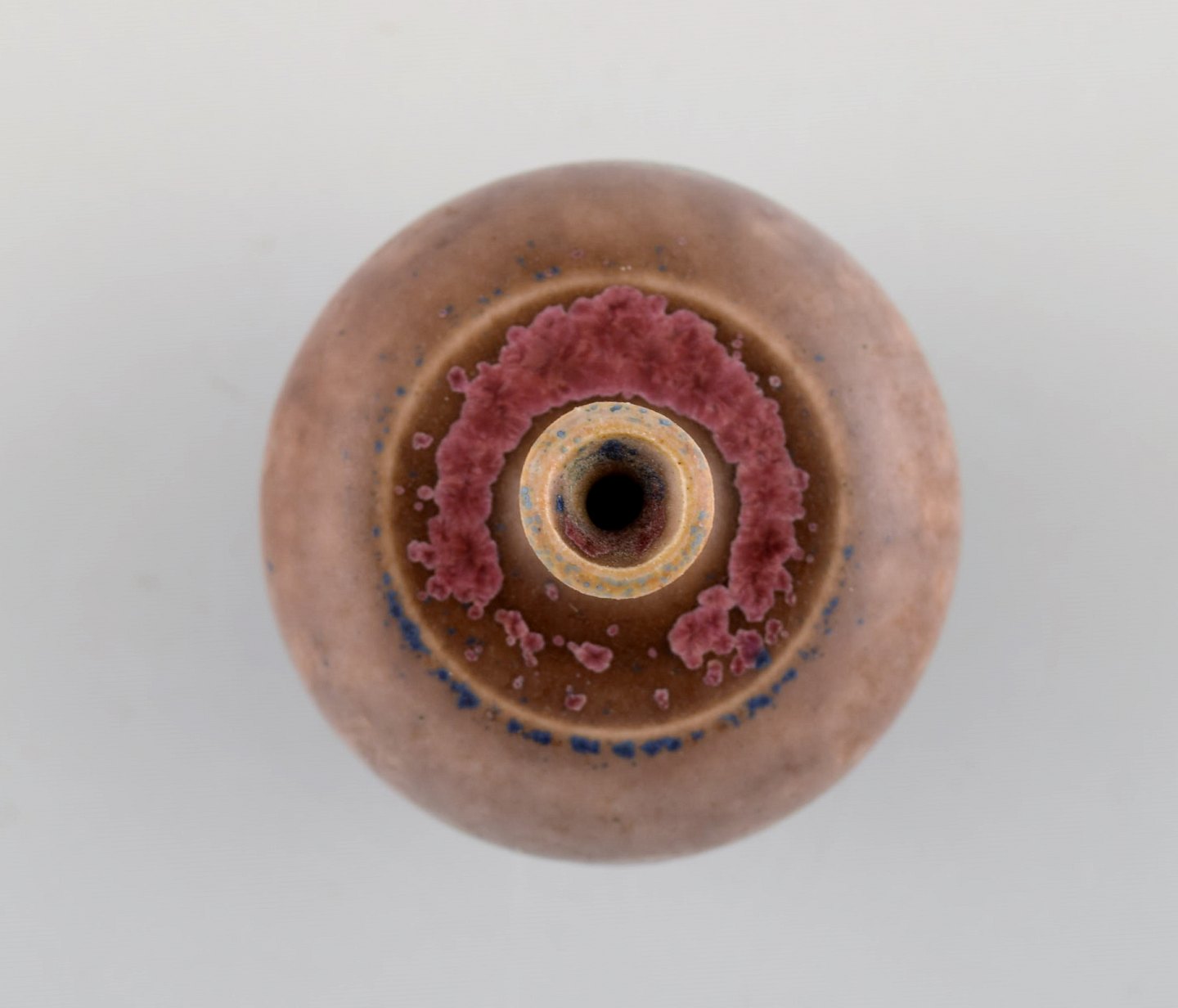 Isak Isaksson, Swedish ceramist. Unique vase in glazed ceramics. Beautiful glaze in brown and blue shades. Dated 1988. Measures: 5 x 4.5 cm. In very good condition. Signed.
