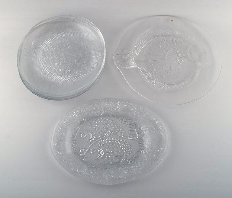 Swedish glass art. Six plates and two dishes with fish motifs. 1980's. Largest dish measures: 31.5 cm. plate measures: 25.5 cm. In very good condition.
