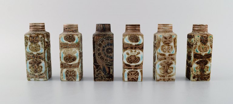 Nils Thorsson og Johanne Gerber for Aluminia, Royal Copenhagen. Seks Baca vaser med mønstret glasur i nuancer af grøn, blå og brun. 1960'erne. Måler: 12 x 4,2 cm. I flot stand. Stemplet.