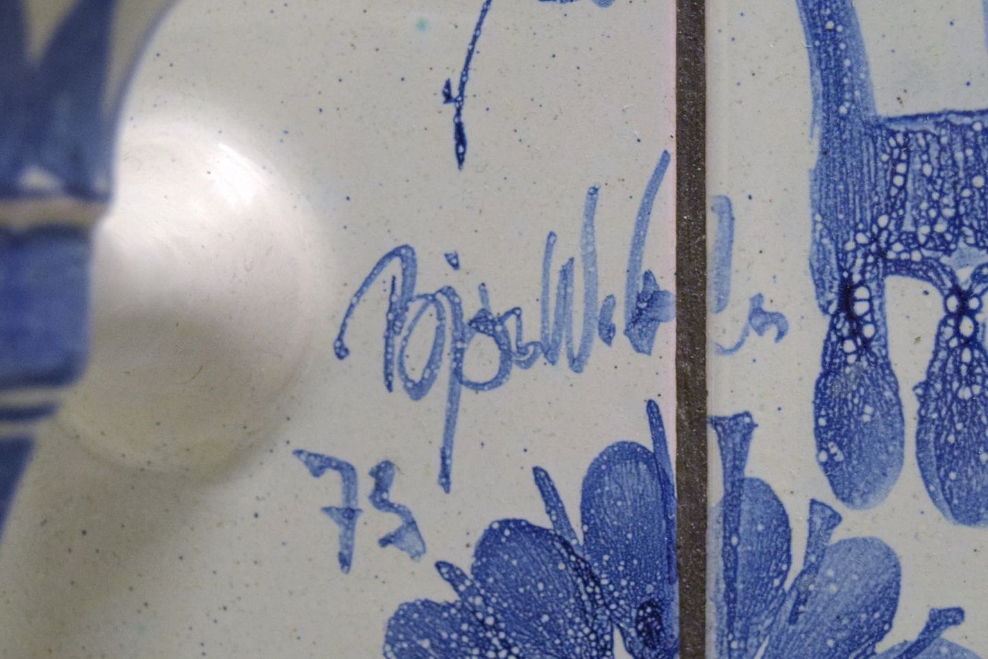 Bjørn Wiinblad (1918-2006). Kolossalt ottekantet unika væglysestage/relief med tre lysarme udført i blåglaseret keramiske kakler, dekoreret med kvinde og blomster omkranset af geometrisk ornamentik. Dateret 1973.