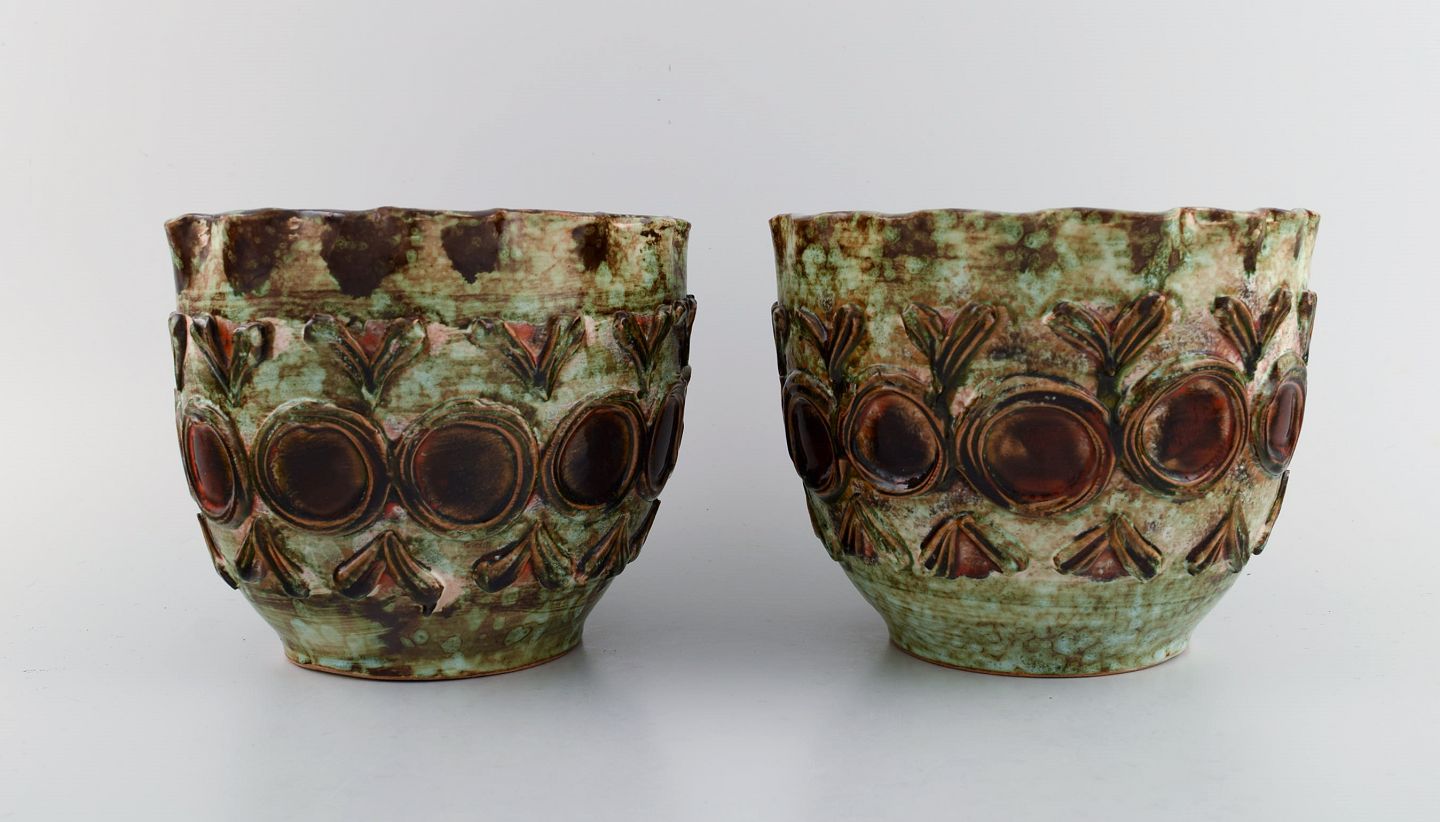 Europæisk studio keramiker. To urtepotteskjuler i glaseret keramik. 1960/70'erne. Måler: 18 x 15 cm. I flot stand.
