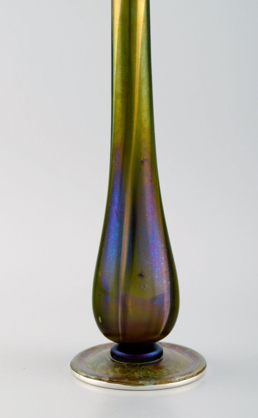Stor Tiffany Favrile vase i iriserende kunstglas med sølvmontering. Tidligt 1900-tallet. Måler: 35 x 9,5 cm. I flot stand. Signeret.