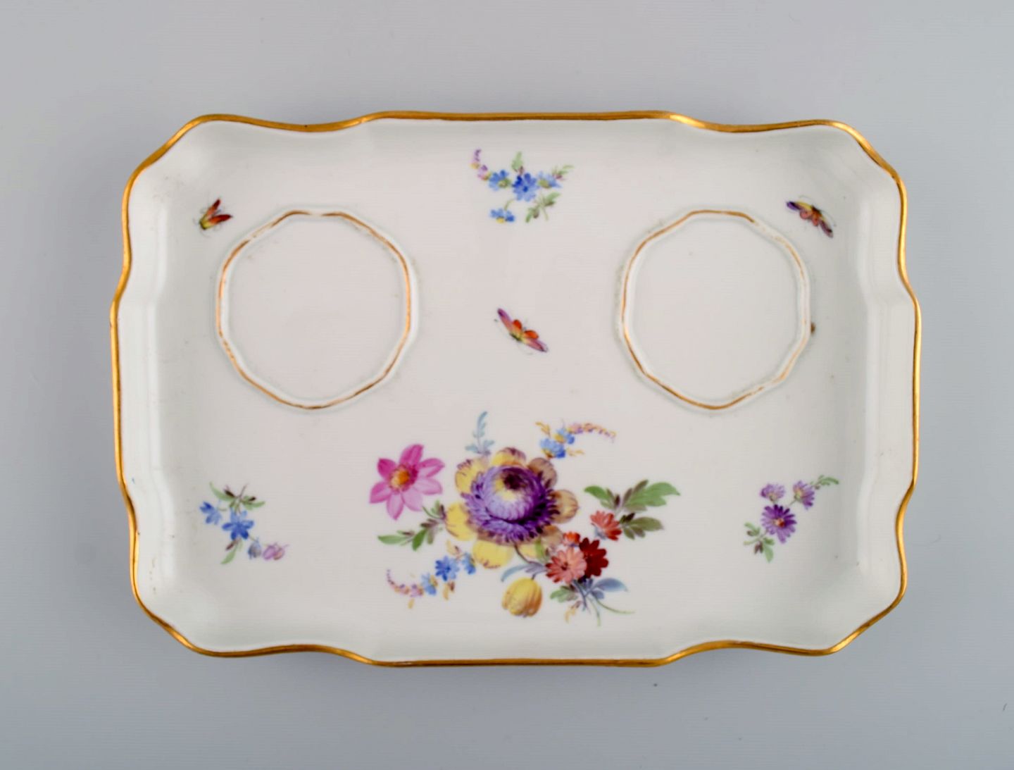 Antikt Meissen blækhus i håndmalet porcelæn med blomstermotiver og gulddekoration. 1800-tallet. Bakken måler: 22 x 15 cm. Blækhusene måler: 7,5 x 5,5 cm. I flot stand. Stemplet. 1. Sortering.