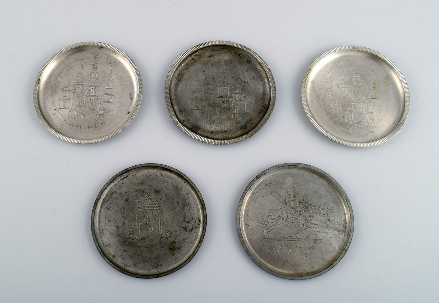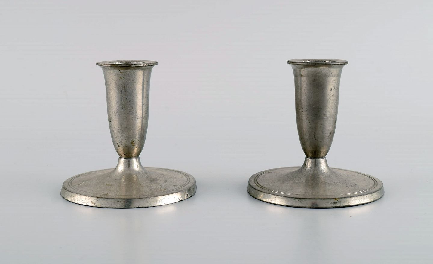 Just Andersen. To lysestager, otte flaskebakker og et krus i tin. 1930/40'erne. I god stand med brugspræg. Største lysestage måler: 8,5 x 8 cm. Koppen måler: 7 x 6 cm. Stemplet. Modelnummer: 2700, m.fl.