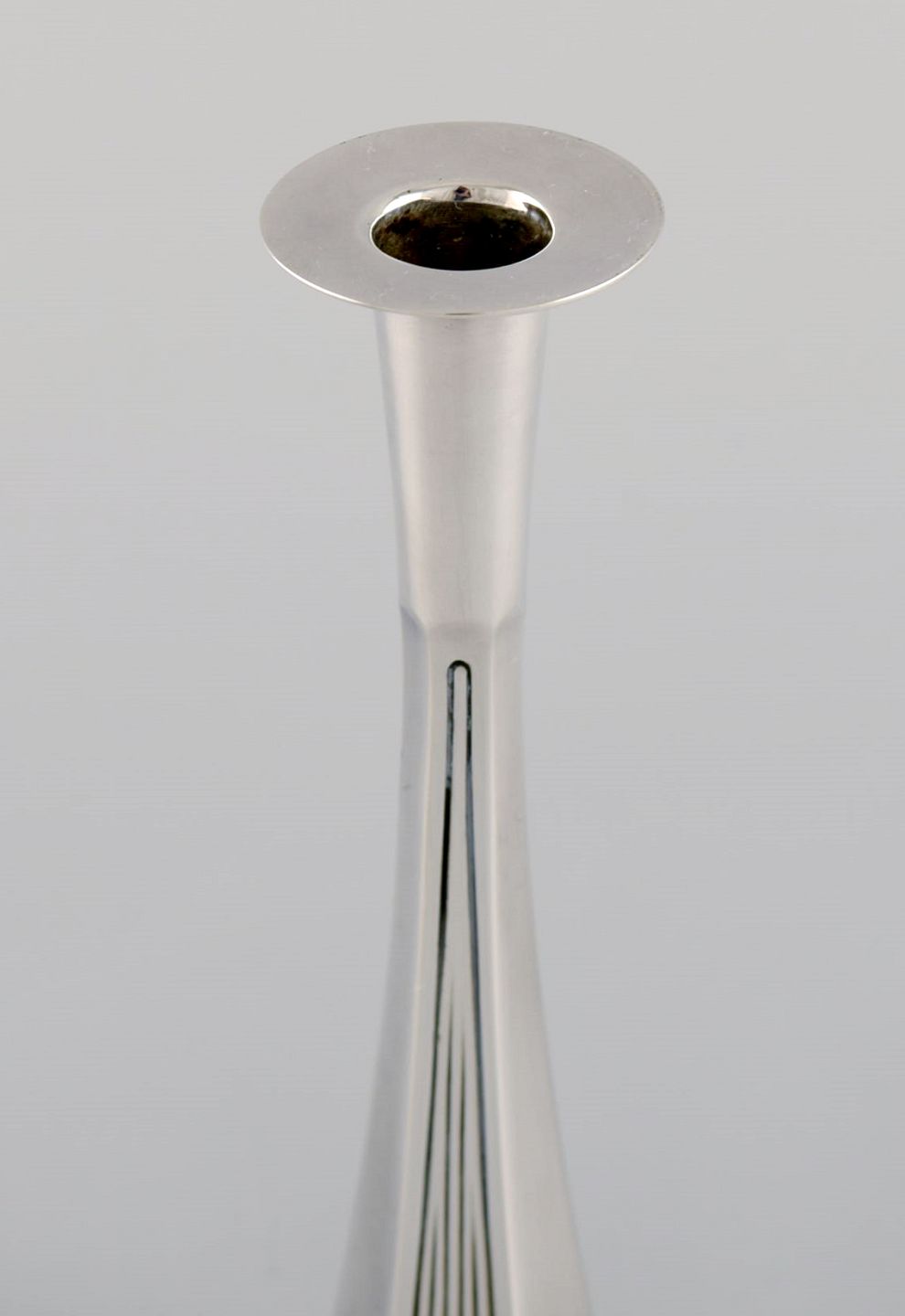 Wiwen Nilsson Lund, Sverige (f. 1897, d. 1974). Et par modernistiske stager i sølv. Dateret 1963. Måler: 13 x 3 cm. I flot stand. En med let slid. Stemplet.