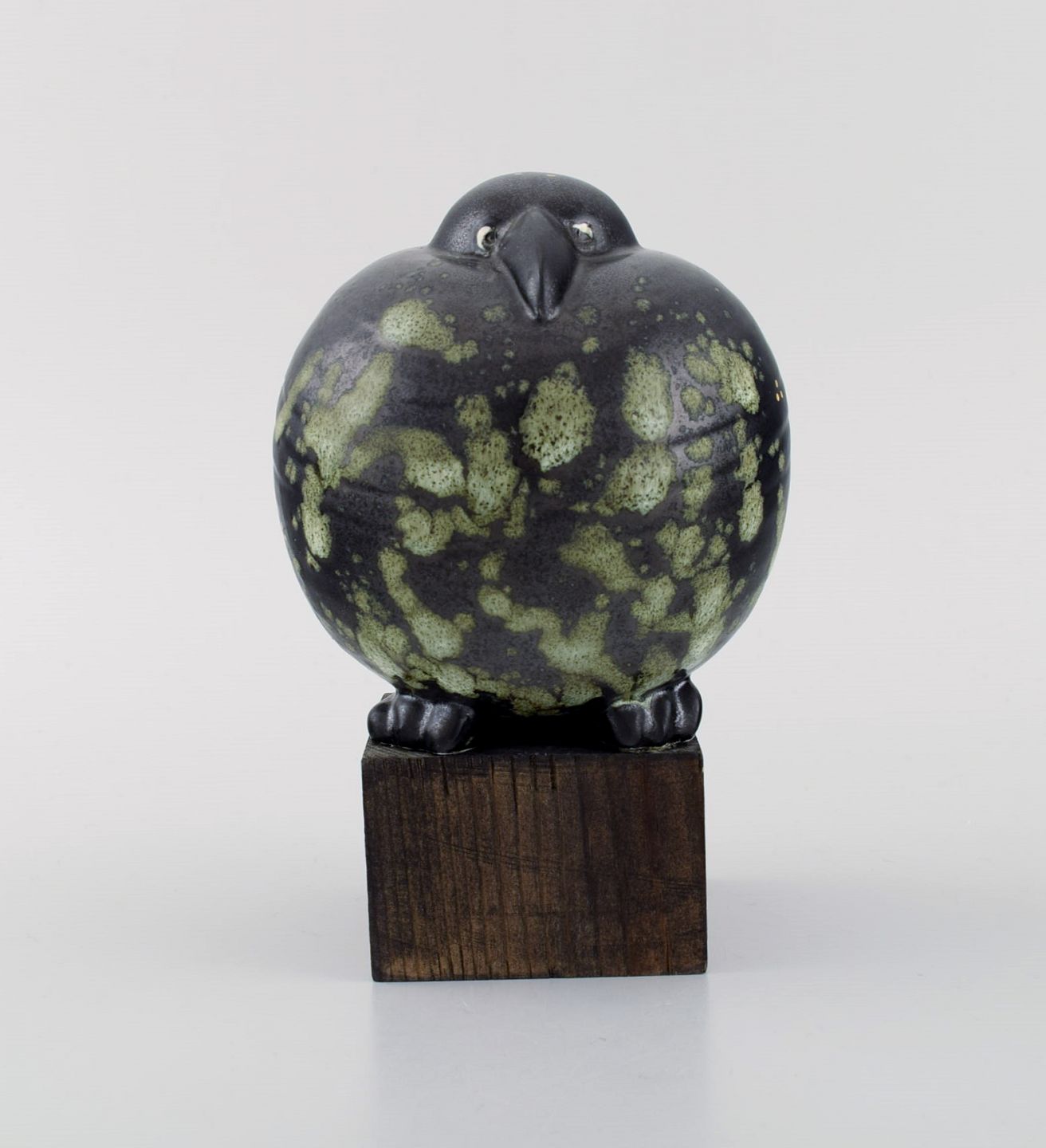 Sjælden figur, Lisa Larson for Gustavsberg. Sort fugl i glaseret keramik på træsokkel. 1990'erne.