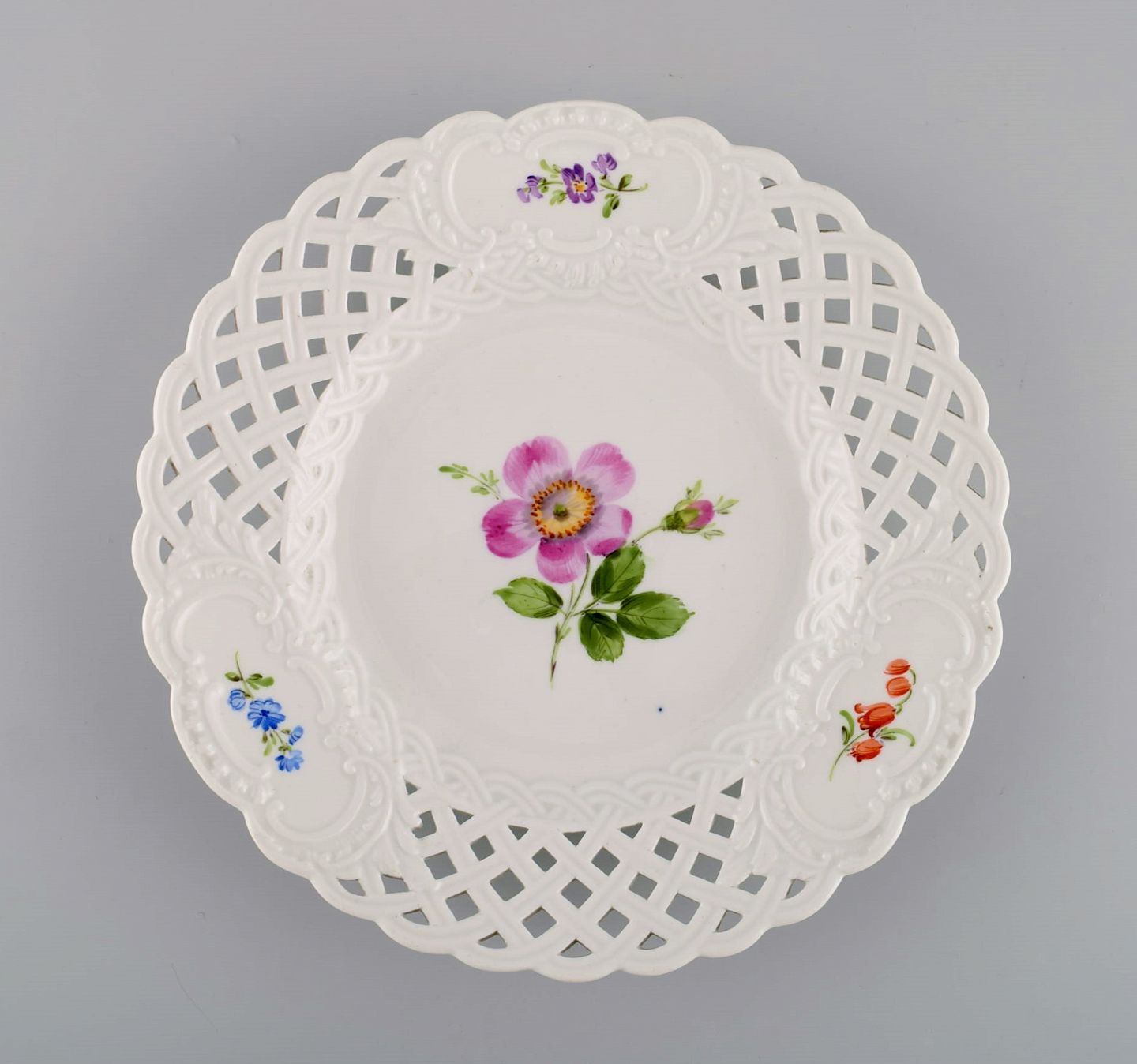 Antik Meissen skål og tre tallerkener i porcelæn med håndmalede blomster. 1800-tallet. Største tallerken diameter: 24 cm. Skålen måler: 13,5 x 3 cm. I flot stand. Stemplet. 1. og 2. Sortering.