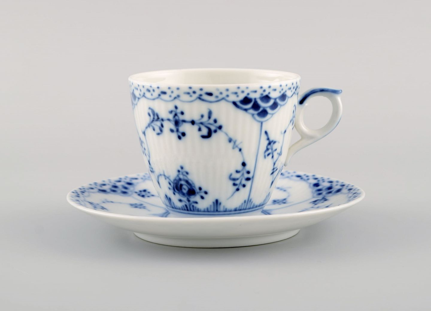 Tolv Royal Copenhagen Musselmalet Halvblonde kaffekopper med underkopper. Modelnummer 1/719. Midt 1900-tallet.