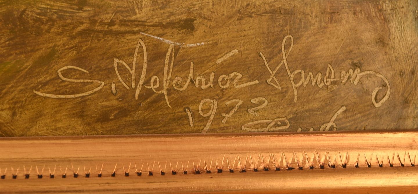 Søren Melchior Hansen (1908-1977), Danmark. Olie på plade. Dansk sommeridyl med stråtækt bindingsværkshus. Dateret 1972.