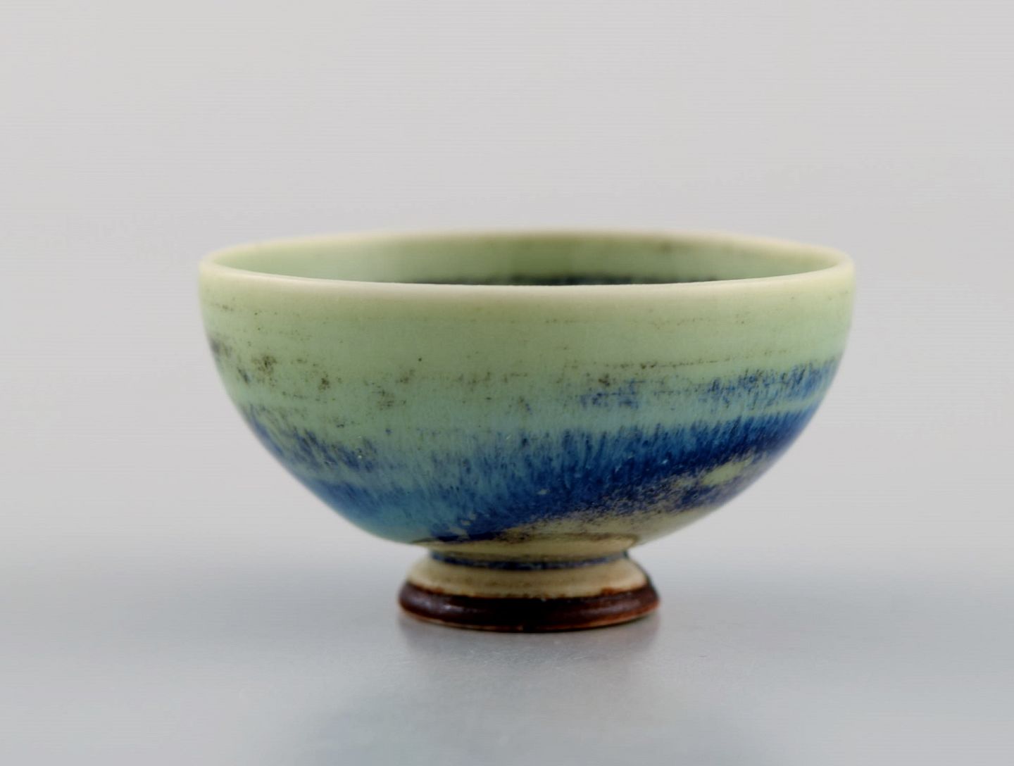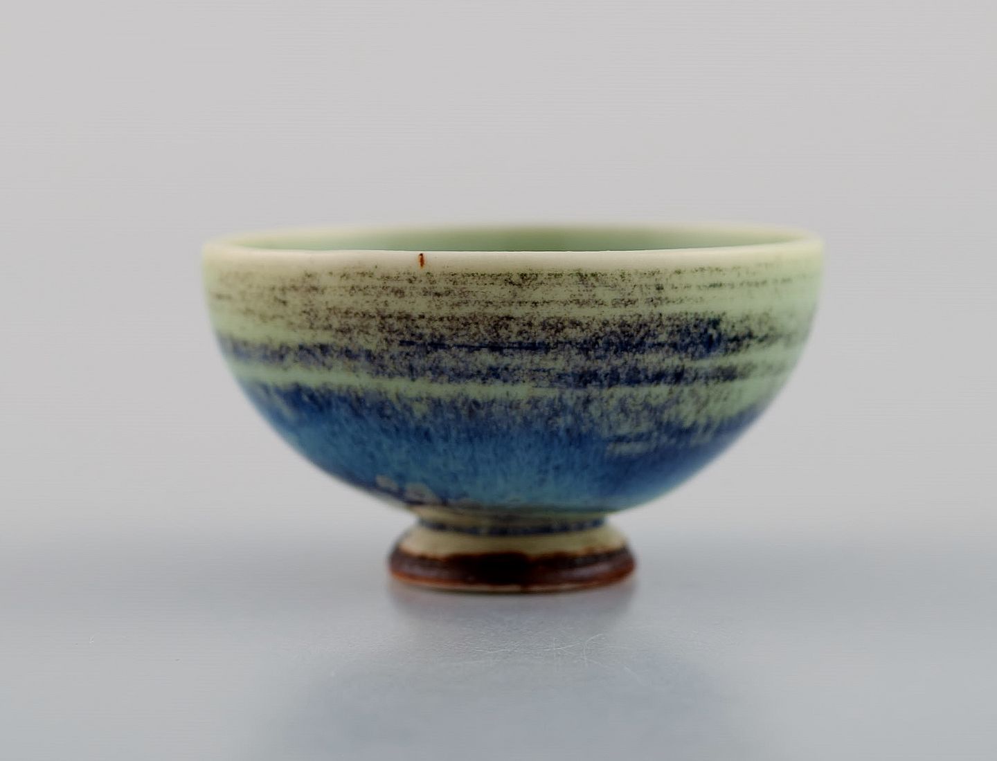 Berndt Friberg (1899-1981) for Gustavsberg Studiohand. Miniature skål i glaseret stentøj. Smuk glasur i blågrønne nuancer. 1960'erne. Måler: 4,5 x 2,5 cm. I flot stand. Signeret.