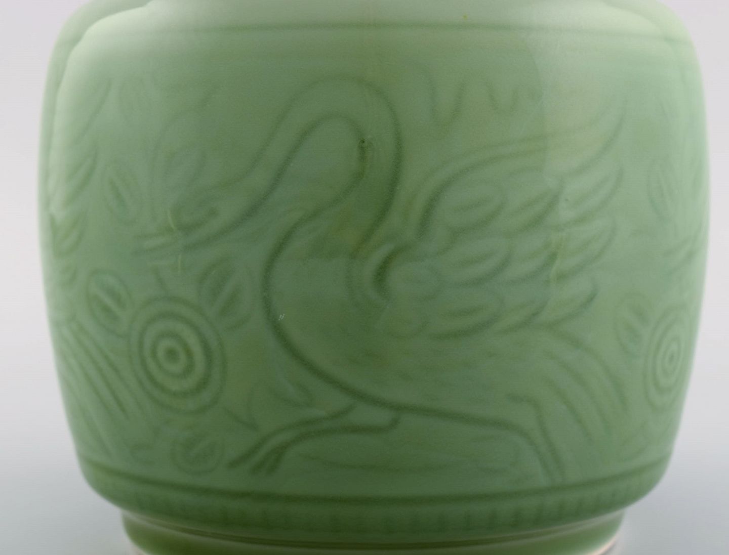 Royal Copenhagen vase i glaseret keramik dekoreret med svaner. Smuk celadon glasur. 1940'erne. Måler: 17,5 x 17 cm. I flot stand. Stemplet. 1. Sortering.