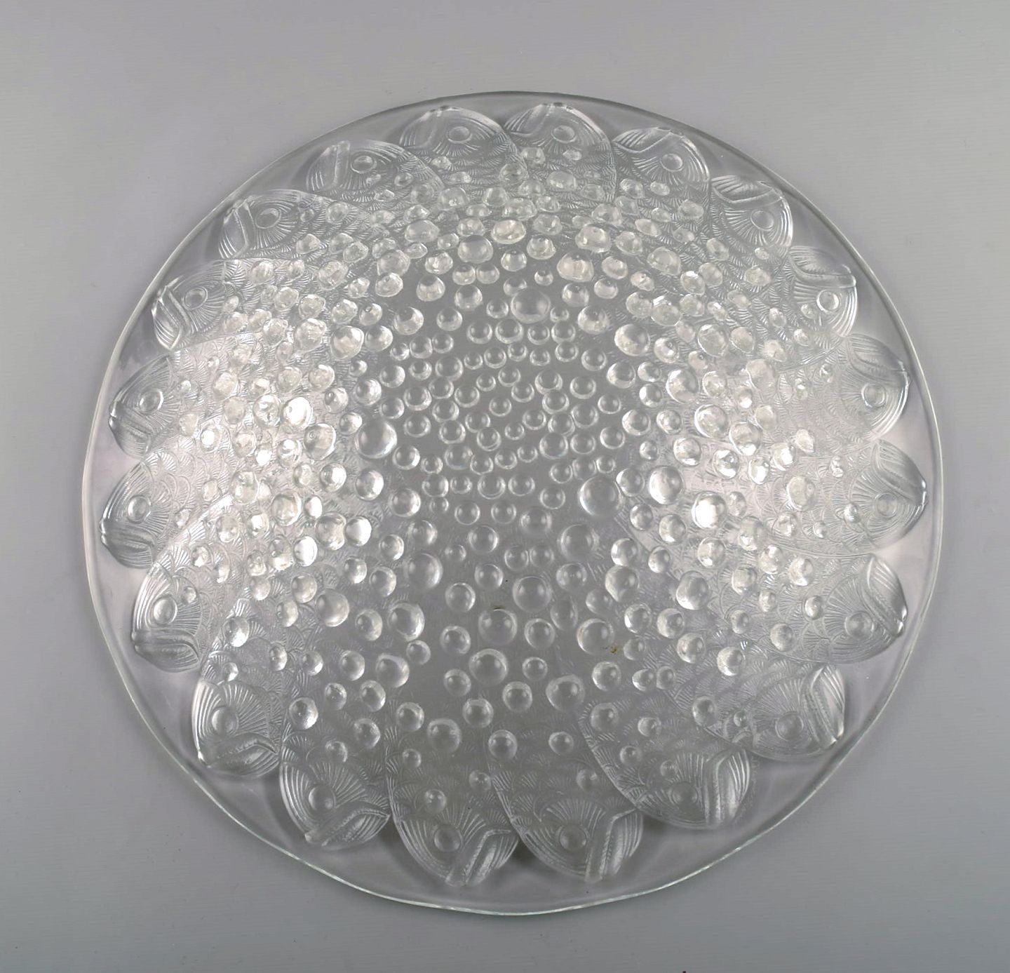 Stor René Lalique "Roscoff" skål dekoreret med fisk. Midt 1900-tallet. Måler: 35 x 7 cm. I flot stand. Signeret.