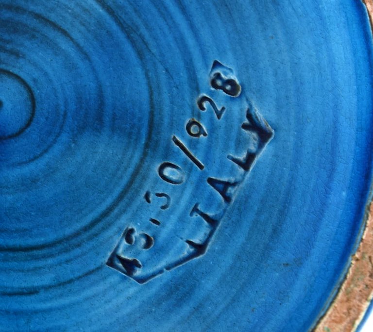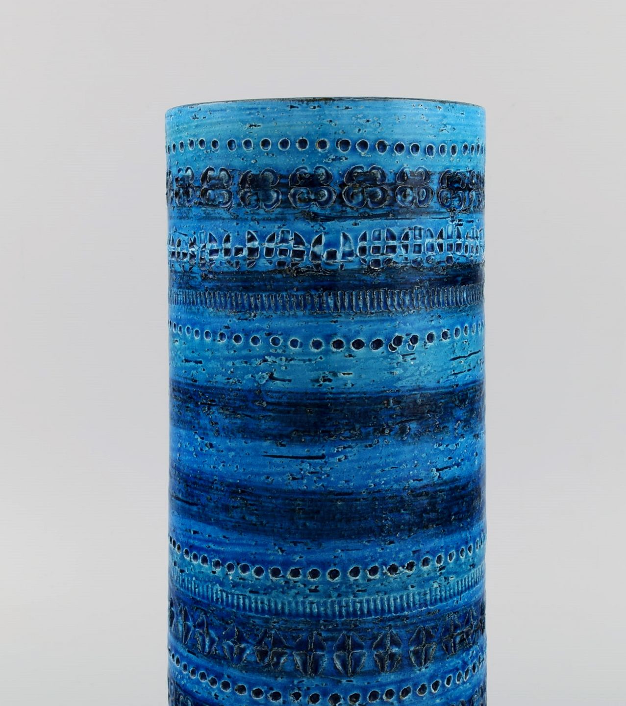 Aldo Londi for Bitossi. Large cylindrical vase in Rimini-blue glazed ceramics with geometric patterns. 1960s. Measures: 29.5 x 12 cm. In excellent condition. Stamped.