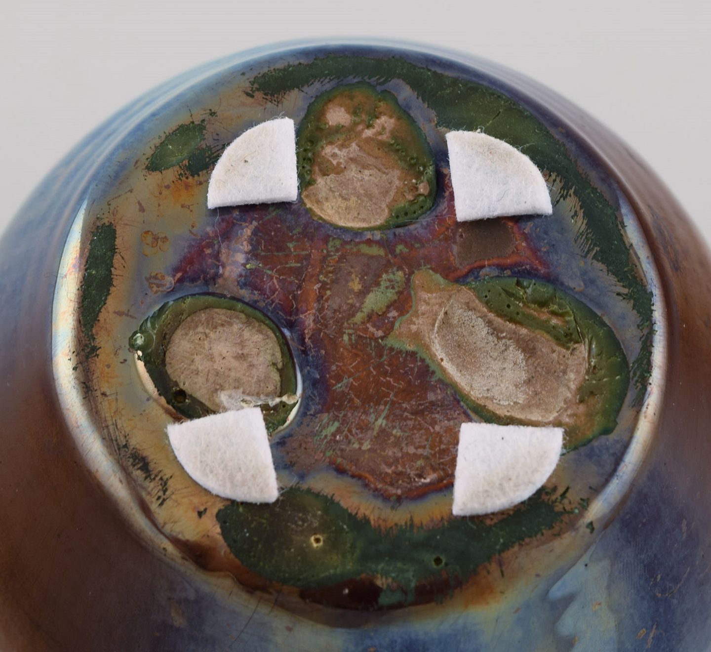 Søren Kongstrand (1872-1951), Denmark. Round vase in glazed stoneware. Beautiful metallic luster glaze in violet and red shades. 1920s. Measures: 11 x 11 cm. In excellent condition. Signed in monogram.