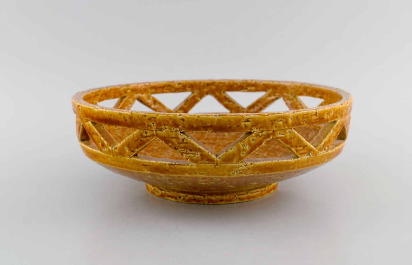 Gunnar Nylund for Rörstrand. Chamotte skål i gennembrudt glaseret keramik. Smuk sennepsgul glasur. Midt 1900-tallet Måler: 25 x 9 cm. Stemplet. I flot stand.