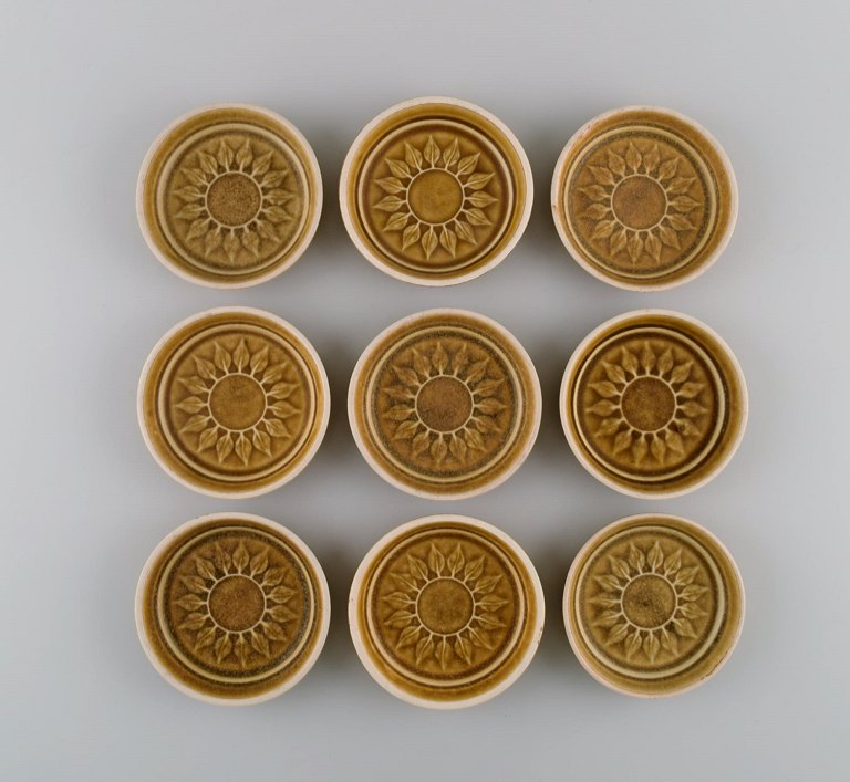 Jens H. Quistgaard (1919-2008) for Bing & Grøndahl / Nissen Kronjyden. 9 Relief skåle / flaskebakker i glaseret stentøj. Smuk glasur i sennepsgule nuancer. 1960'erne.