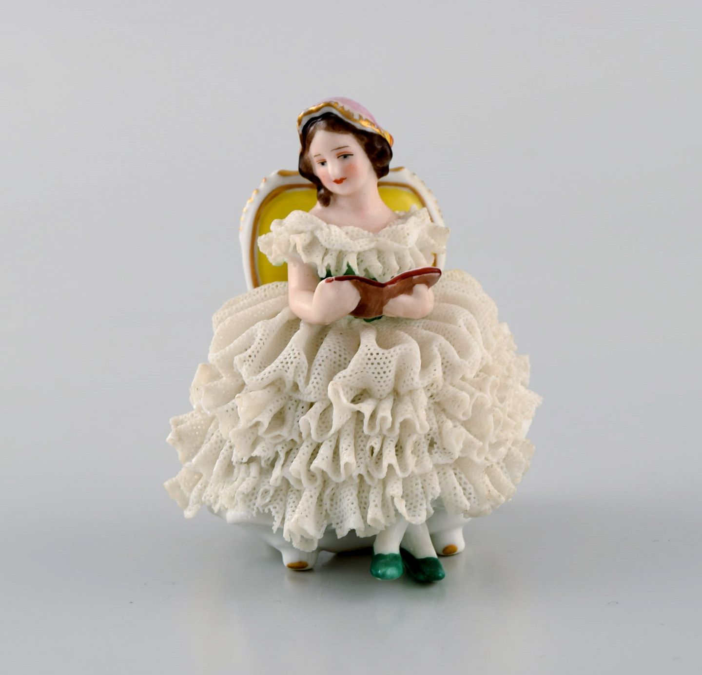 Volkstedt Rudolstadt, Tyskland. Porcelænsfigur. Læsende kvinde i skørt. Midt 1900-tallet. Måler: 7 x 6 cm. I god stand. Minimalt skår. Stemplet.