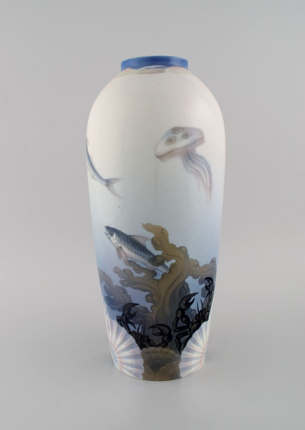 Effie Hegermann-Lindencrone for Bing & Grøndahl. Large art nouveau porcelain vase with hand-painted fish, crabs and jellyfish. Shells in relief. Early 20th century.