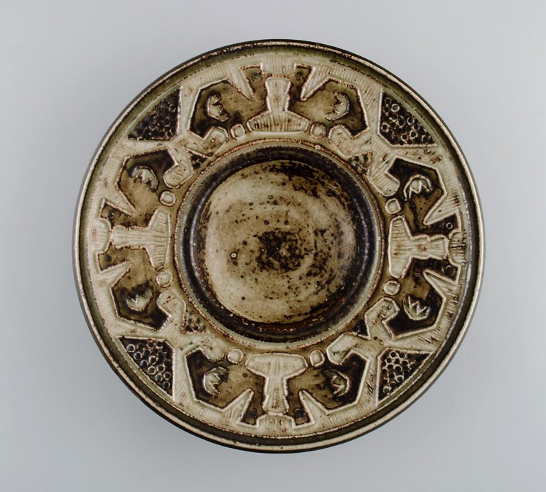 Jørgen Mogensen for Royal Copenhagen. Stor skål i glaseret stentøj dekoreret med fugle. Smuk sung glasur. 1970'erne.