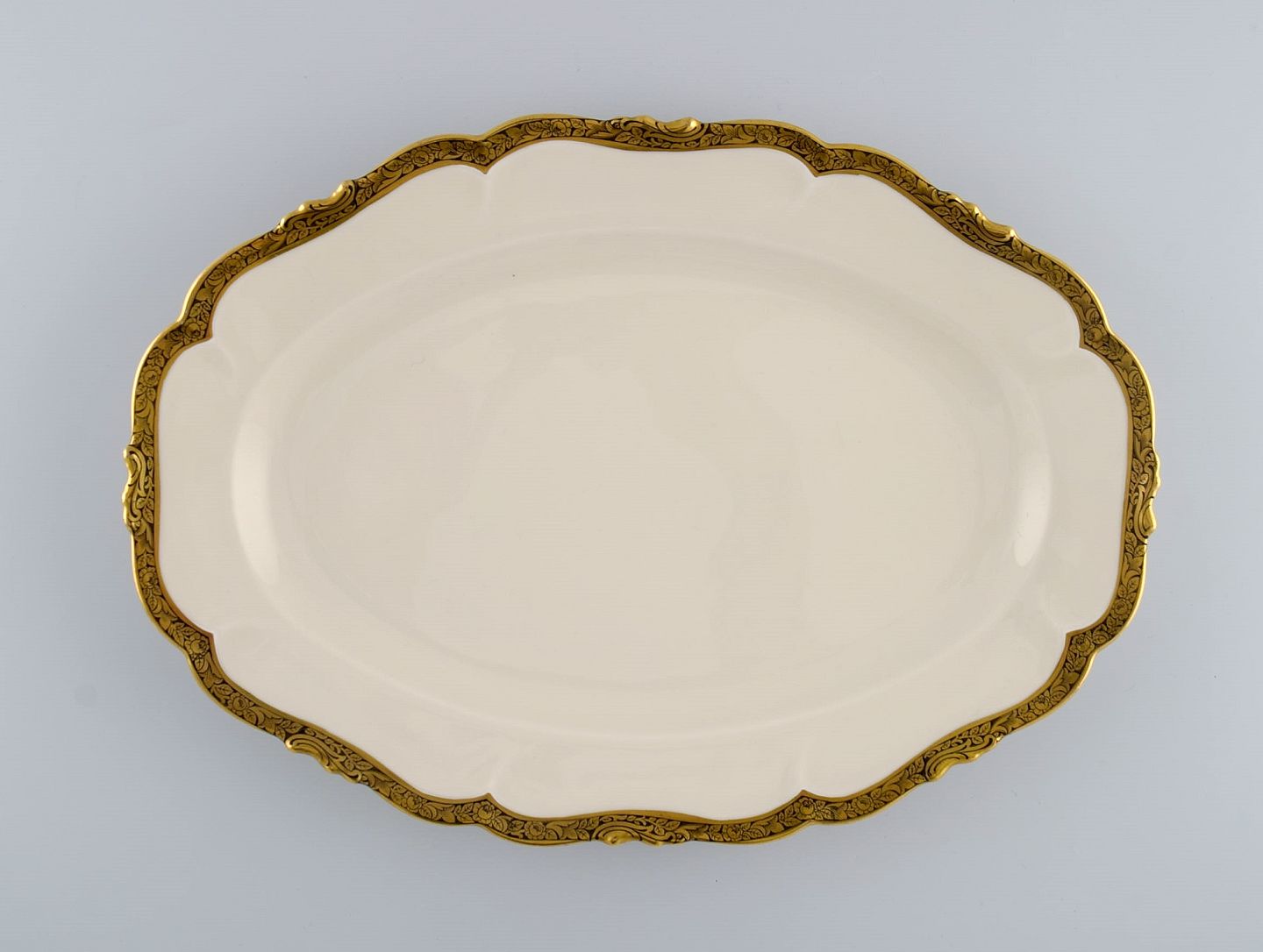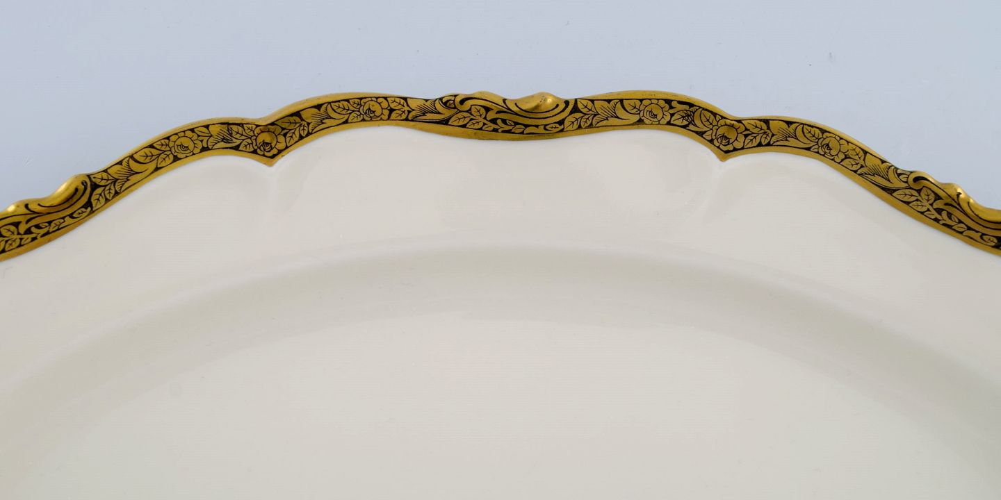 KPM, Berlin. Three Royal Ivory serving dishes in cream-colored porcelain with gold decoration. 1920s. Largest measures: 33 x 23 cm. Smallest measures: 25 x 14.5 cm. In excellent condition. Stamped.