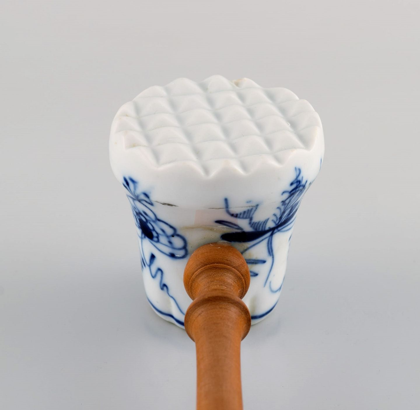 Antageligt Meissen Løgmønstret kødhammer i håndmalet porcelæn med hank i drejet træ. Ca. 1900. Længde: 30,5 cm. I flot stand.