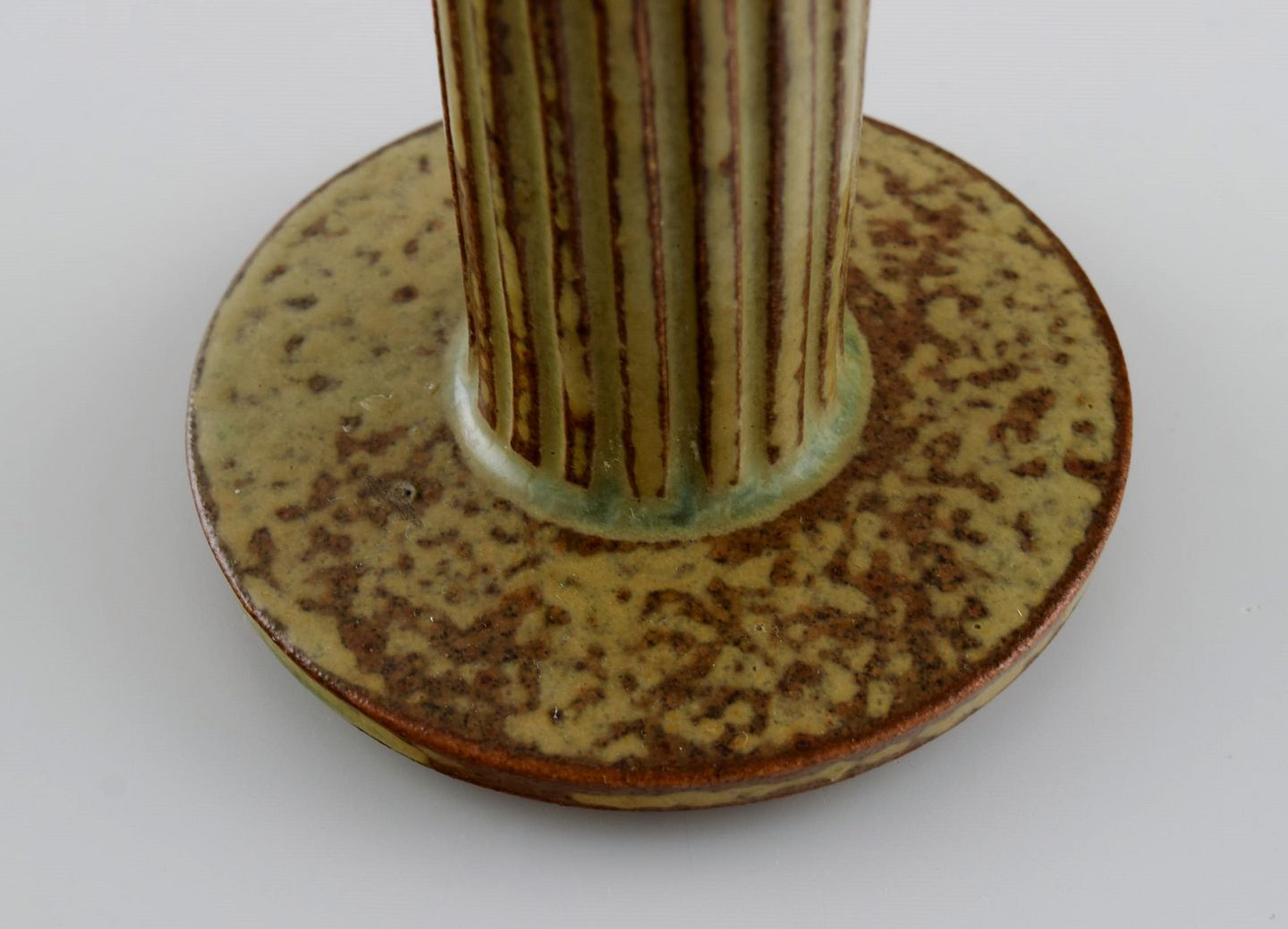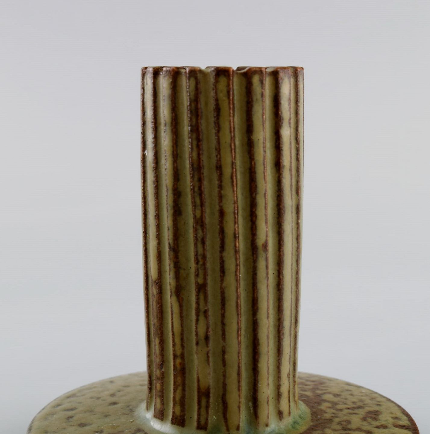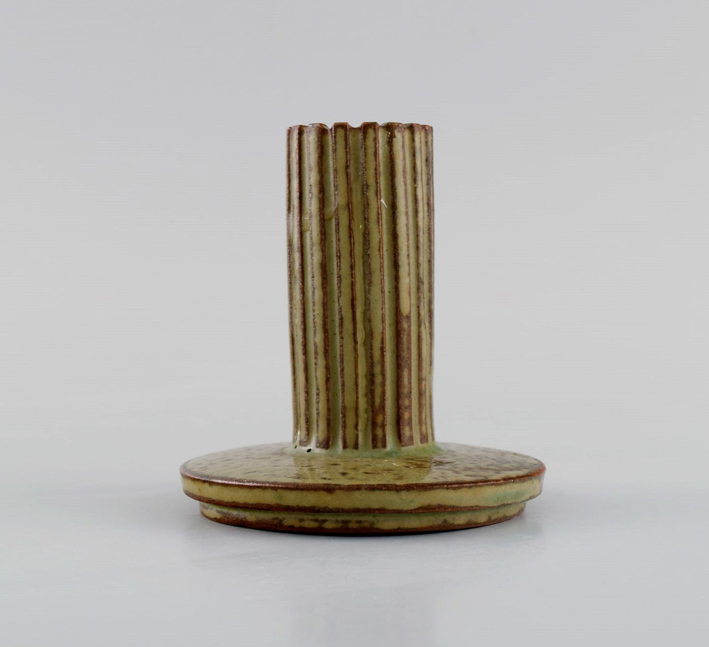 Arne Bang (1901-1983), Danmark. Lyseholder i glaseret keramik. Rillet korpus og smuk glasur i lyse jordnuancer. Midt 1900-tallet. Modelnummer 133. Måler: 9 x 9 cm. I flot stand. Signeret.
