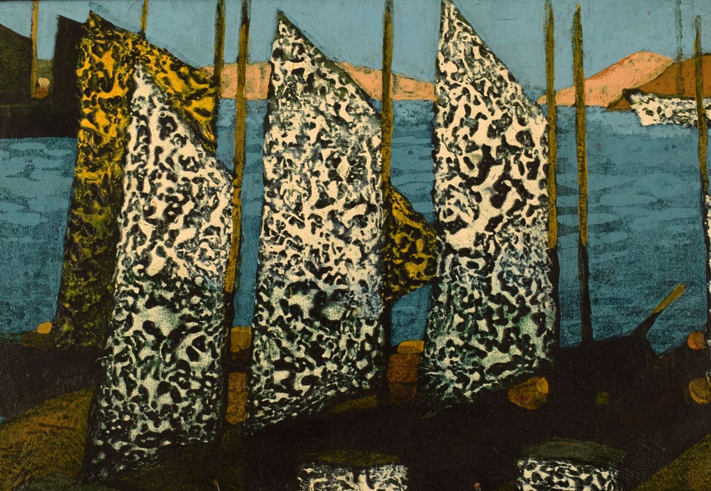 Sven Ahlgren (1922-1997), Sweden. Oil on board. Modernist landscape with fishing boats. Dated 1965.