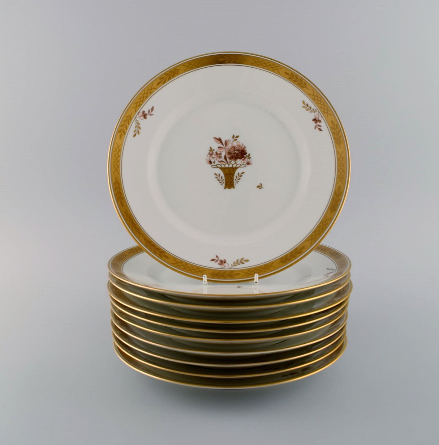 10 Royal Copenhagen Golden Basket dinner plates in hand-painted porcelain with flowers and gold decoration. 1960s. Model number 595/9586. Diameter: 25 cm. In excellent condition. Stamped. 1st factory quality.