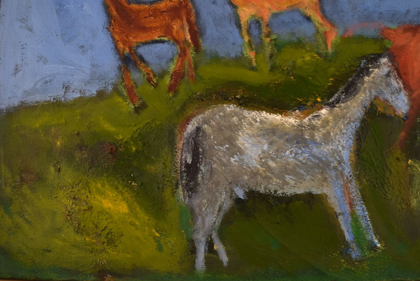 Jens Søndergaard (1895-1957), Denmark. Oil on canvas. Modernist landscape with horses. Mid-20th century. The canvas measures: 90 x 68 cm. The frame measures: 1.5 cm. In excellent condition. Signed.
