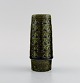 Palshus vase i glaseret stentøj med mønstret dekoration. Smuk glasur i mørkegrønne nuancer. 1960'erne. Måler: 12 x 6 cm. I flot stand. Signeret.