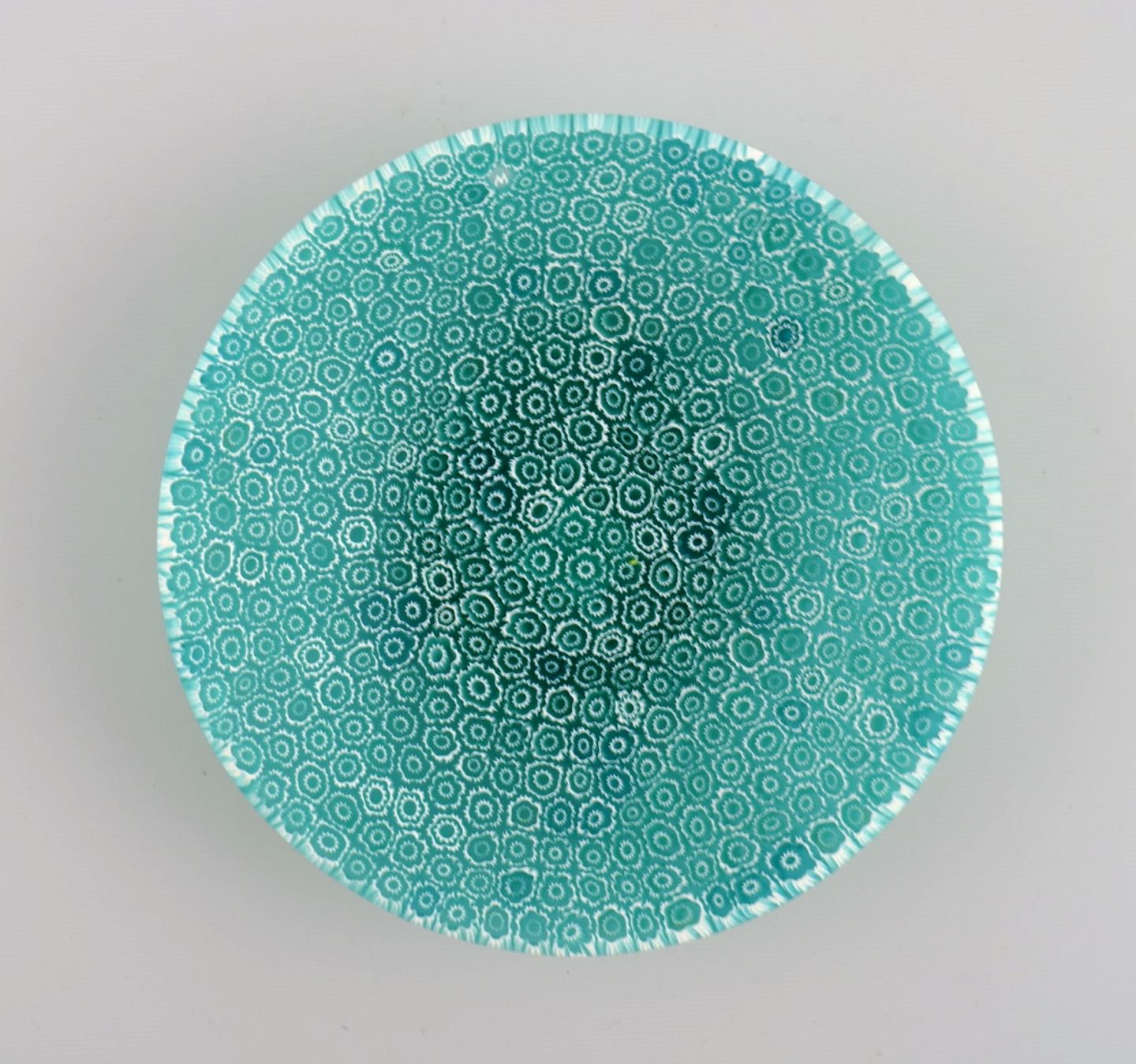Murano Mille Fiori bowl in turquoise mouth blown art glass. Italian design, 1960s. Measures: 14 x 3 cm In excellent condition.