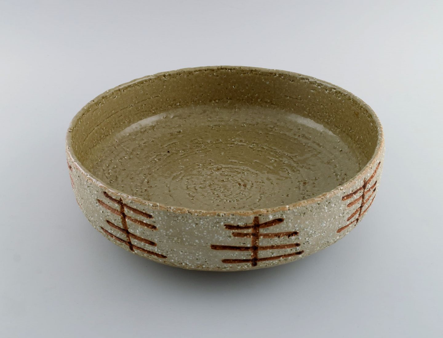 Hertha Bengtson (1917-1993) for Rörstrand. Stor unika skål i glaseret stentøj. Midt 1900-tallet. Måler: 30 x 9 cm. I flot stand. Signeret.